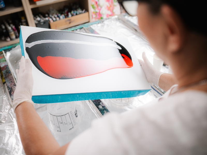 Nun kommt der Moment, in dem das Kunstwerk wirklich zum Leben erwacht. Mit sanften Bewegungen, gezieltem Verziehen, verblasen und dem Hinzufügen feiner Details entstehen Wellen, Strukturen und Effekte, die fast wie von Zauberhand wirken. Am Ende steht ein einzigartiges Kunstwerk, das die Magie des Kunstharzes in voller Pracht zeigt.