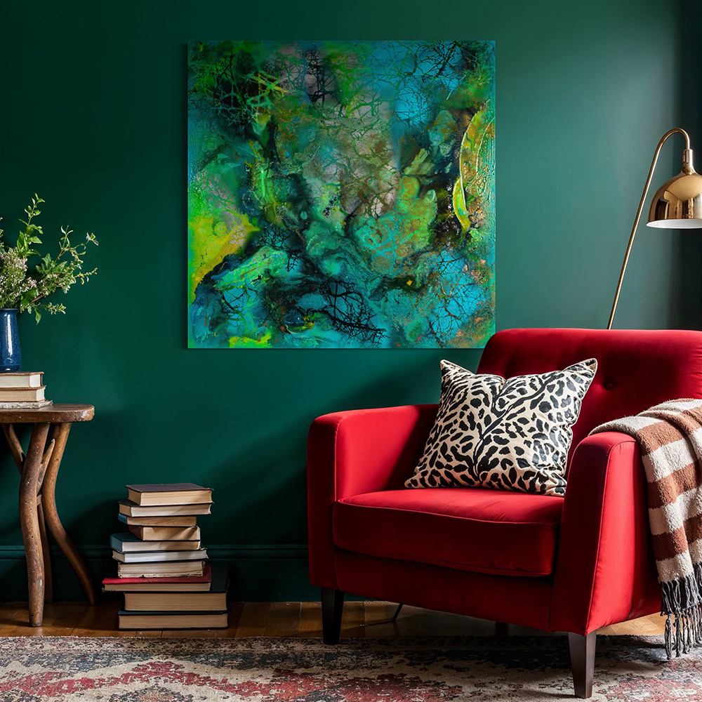 Vernetzte Muster durchziehen das Werk und erinnern an Füße, Bäume und die wilde Natur des Amazonas. Mit Kunstharz veredelt, strahlt es eine fließende, fast wasserartige Dynamik aus und wird zu einem wahrem Eyecatcher in deinem zu Hause. Ein ganz besonderes Werk lädt dich zum träumen ein.
