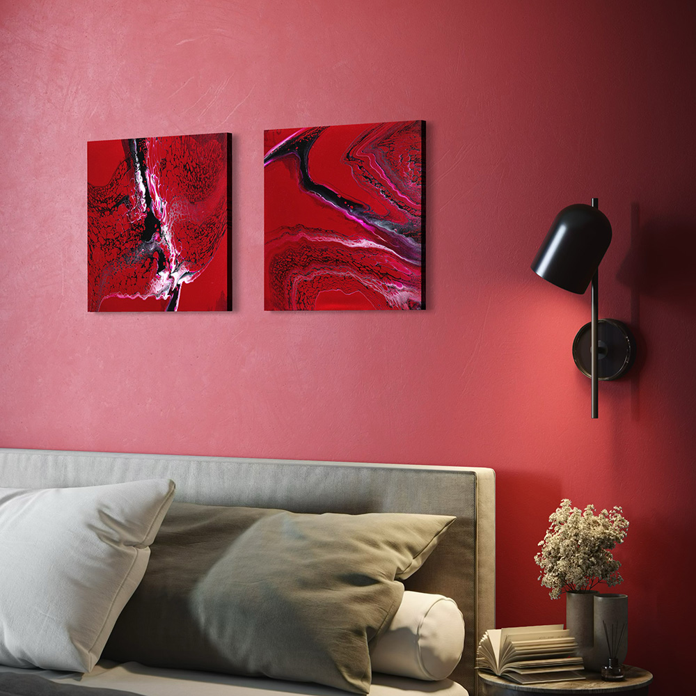 Dieses Duo ist wie zwei Herzen im Einklang. Das tiefe Rot flüstert von der Liebe und Verbundenheit des Lebens. Sie sind wie zwei Weggefährten, die nur gemeinsam ihre volle emotionale Kraft entfalten. Zwei Kunstwerke, die zusammengehören, wie zwei Schläge eines Herzens. Fühlst du es auch? Der Preis gilt für das Set aus 2 Bildern.