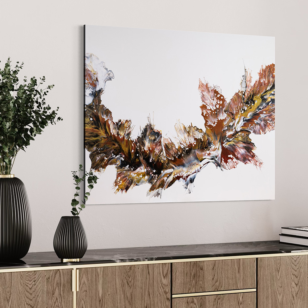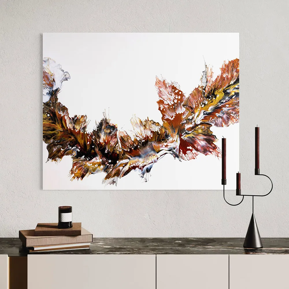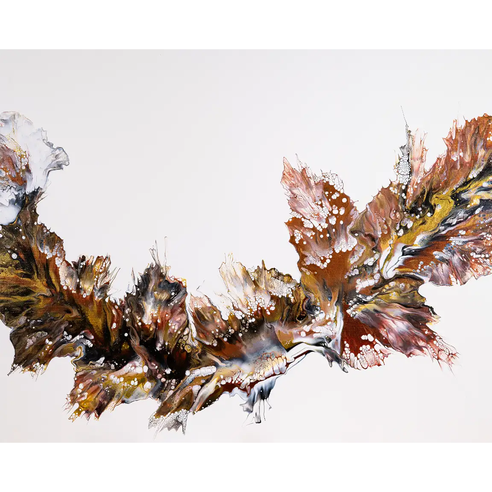 Erdige Magie – als würde der Herbst selbst in Bewegung geraten. Metalltöne tanzen auf der weißen Fläche wie Blätter im Wind. Jede Linie erzählt von Wandel, Loslassen und dem leisen Glanz innerer Reife, ein Atemzug zwischen Vergangenheit und Neubeginn.
