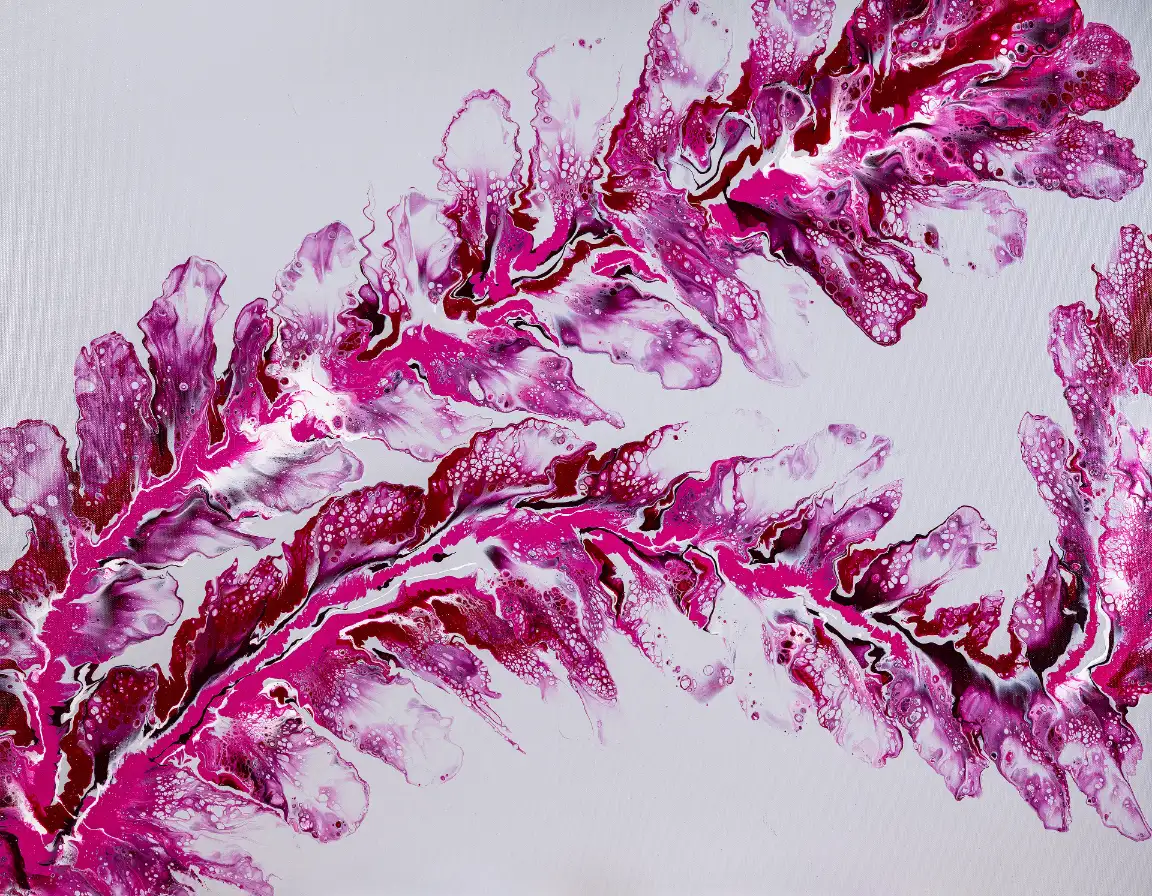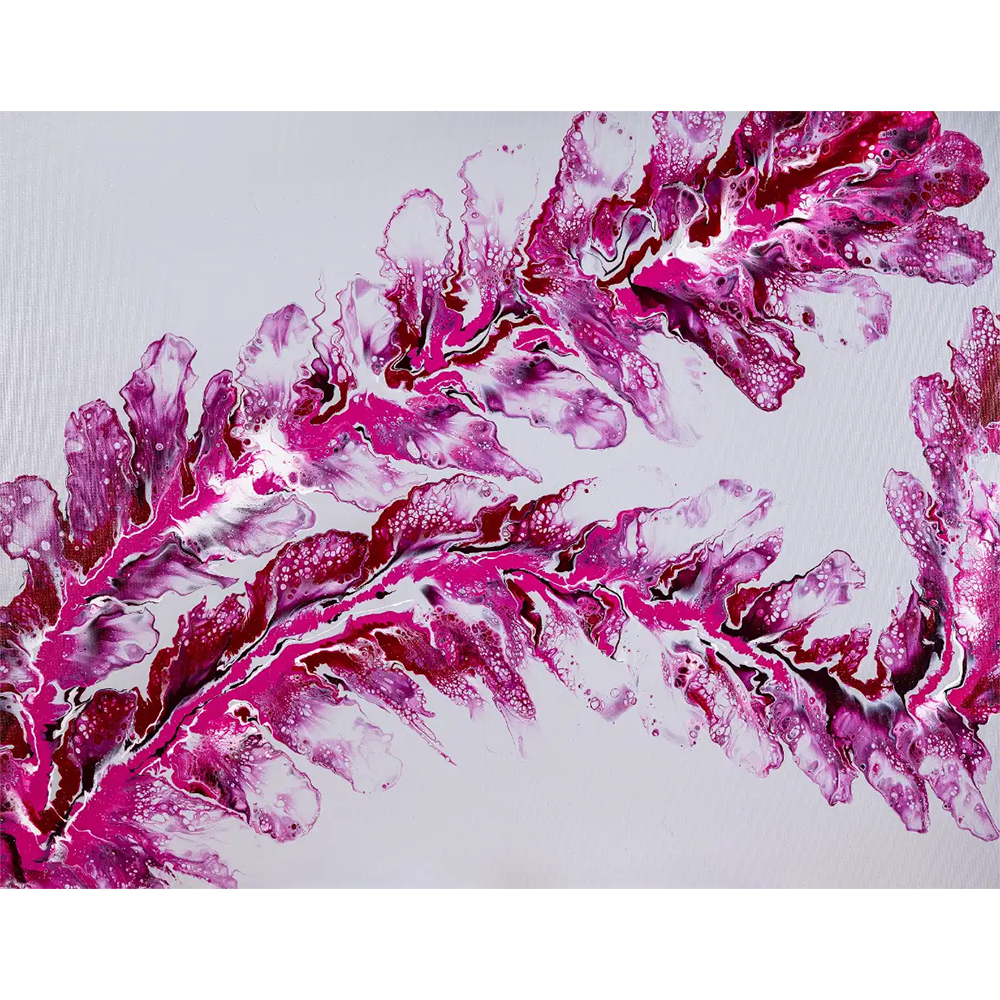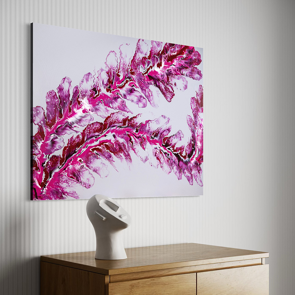Leidenschaft und Lebendigkeit, kraftvolle Magentatöne brechen über dem silbernen, sanften Grund wie eine Welle aus Emotionen und Energie. Es wirkt, als würden sich gegensätzliche Kräfte bewegen – Stärke und Zartheit, Feuer und Sanftmut. Das Bild erzählt vom inneren Aufblühen, von Mut, Liebe und der Schönheit, sich selbst ganz zu zeigen.