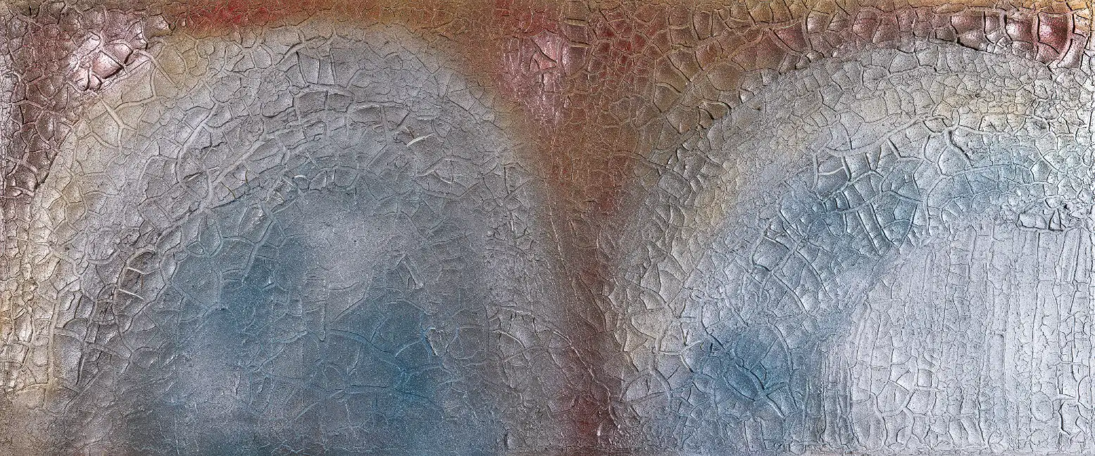 Crackle Strukturen, wie feine Erdschichten, Zeit, Wandel und ein Aufbrechen in eine neue Welt. Es erzählt von Werden, Vergehen und Neubeginn. Die Oberfläche wirkt rissig und lebendig, als hätte sich die Natur selbst in Farbe verwandelt.