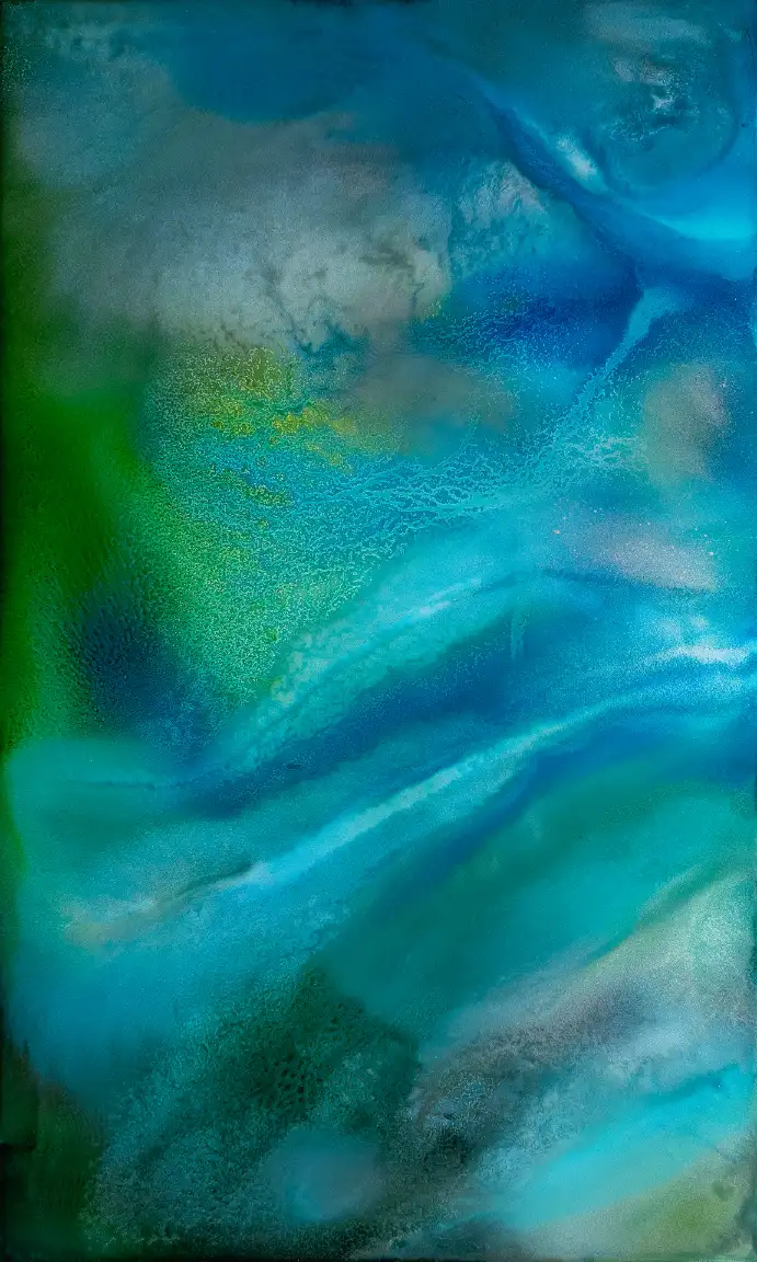 Dieses Bild vereint fließende Blau-, Silber- und Grüntöne zu einem sanft ineinanderschmelzenden Farbspiel. Beruhigend, fast als würde man in eine friedliche Szene aus dem All blicken. Die zarten Übergänge und die ruhigen Farbtöne machen dieses Bild zu einer entspannten, fast meditativen Hommage an kosmische Ruhe und Gelassenheit.