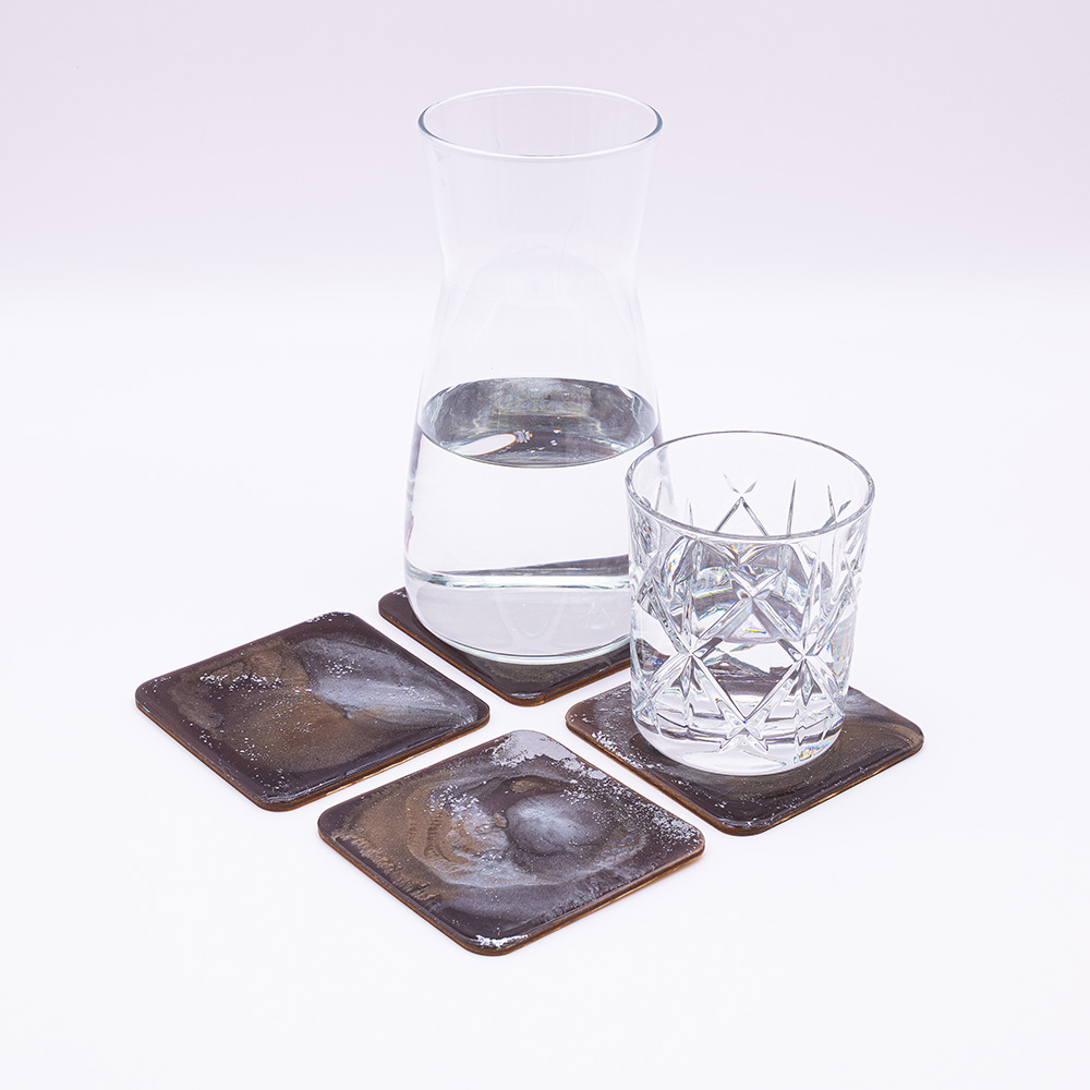 Fließendes Kunstharz auf Holz: diese handgefertigten Untersetzer vereinen natürliche Wärme mit moderner Ästhetik. Jedes Set ist ein kleines Kunstwerk. Die Untersetzer können auch als Auftragsarbeit angefertigt werden. Farbwünsche, individuelle Vorstellungen und Preise auf Anfrage.