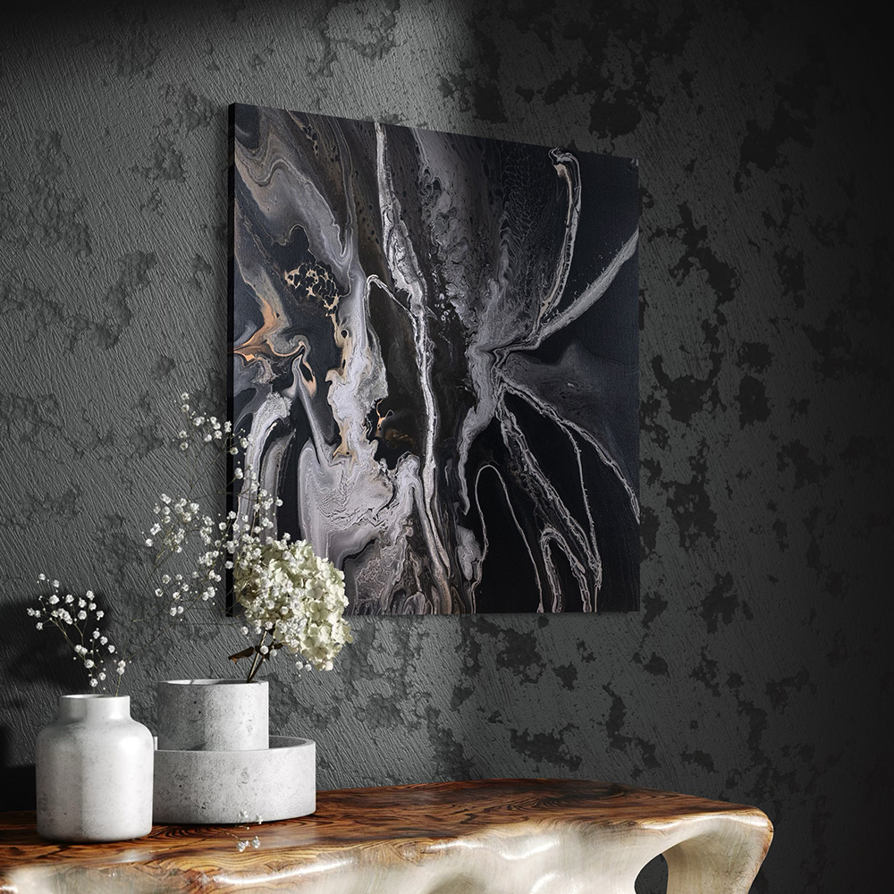 Ein Tanz aus Licht und Schatten, metallische Energiekanäle, Tiefe und Bewegung. Das Werk entfaltet ein unglaubliche Wirkung, ein Spiel aus Kontrolle und Chaos zwischen Materie und Bewegung. Lass dich mitreissen und entfalte deine Energie.