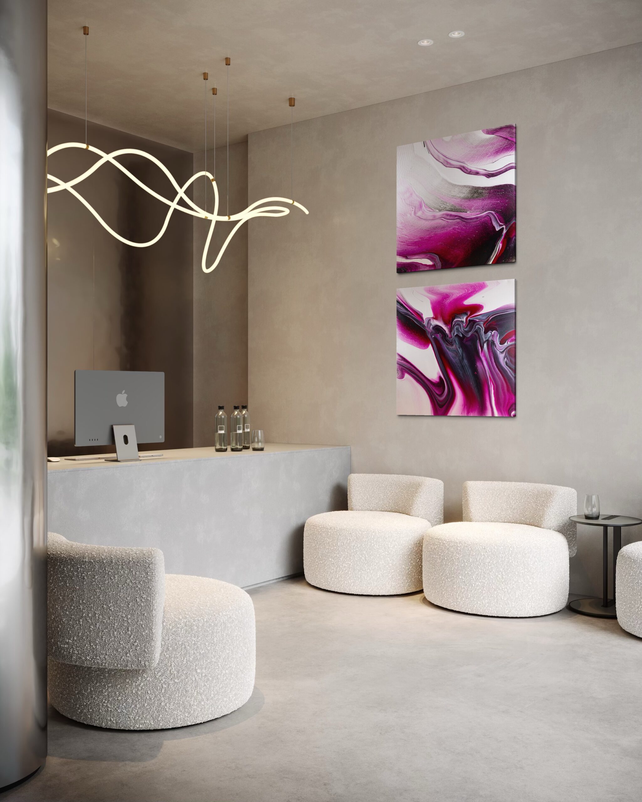 Ein silberner Farbgrund durchzogen von weinroten, pinken Wellen spielt fantasievoll mit den Farbströmen. Eine Traumlandschaft, die zum Verweilen einlädt.
