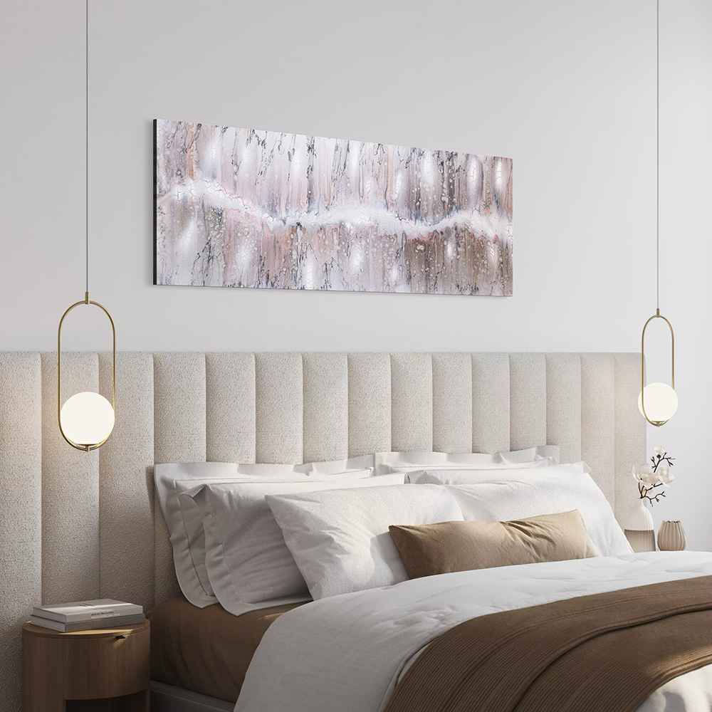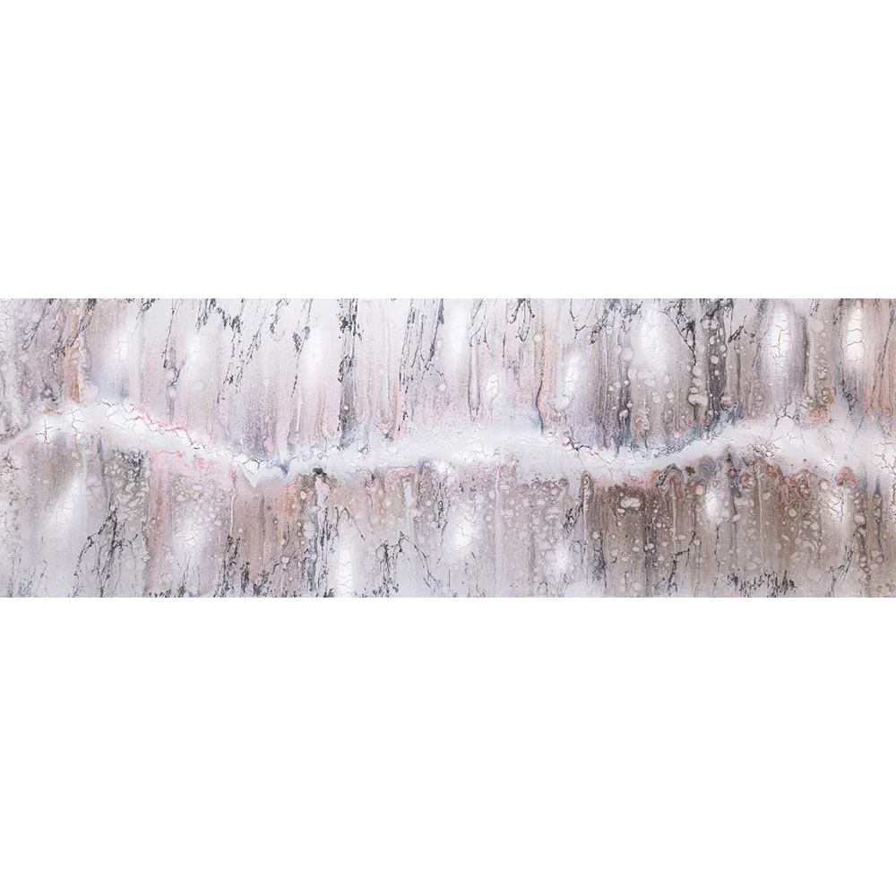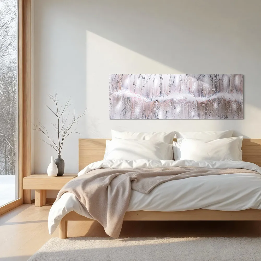 Es entfaltet sich ein sanftes Spiel aus Weiß, Beige und zartem Rose, durchzogen von einem Hauch Glitzer, der an schimmernden Schnee oder zarte Rosenblüten erinnert, Das Werk wirkt luftig und schlicht, fast wie ein flüsterndes Wintermärchen. Beim Anblick fühle ich mich zart umhüllt.
