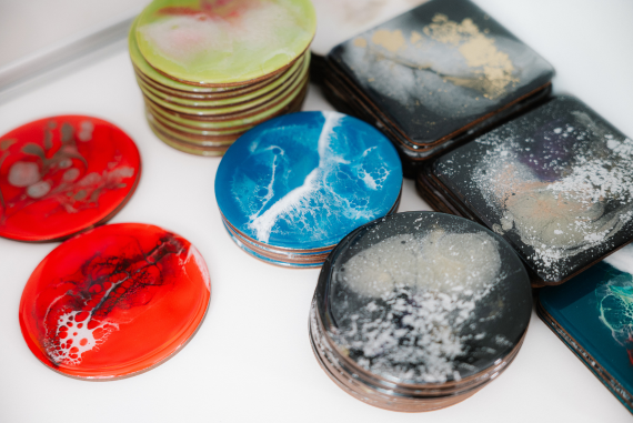 - Begrüßung und Einführung in die verwendeten Materialien: Acrylfarben, Kunstharz und Tinten